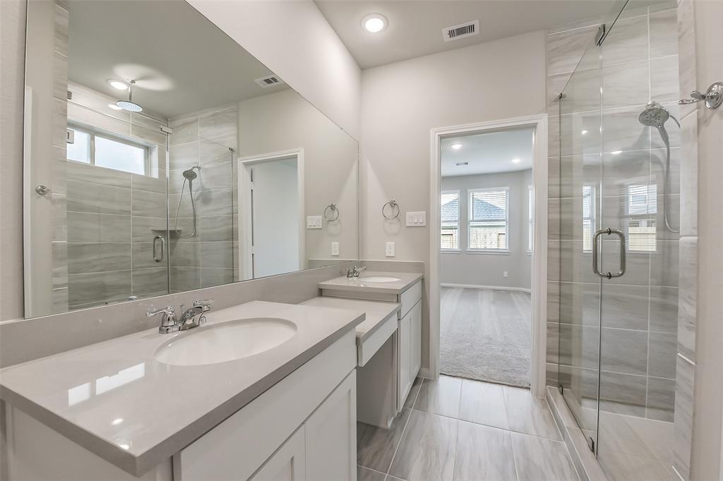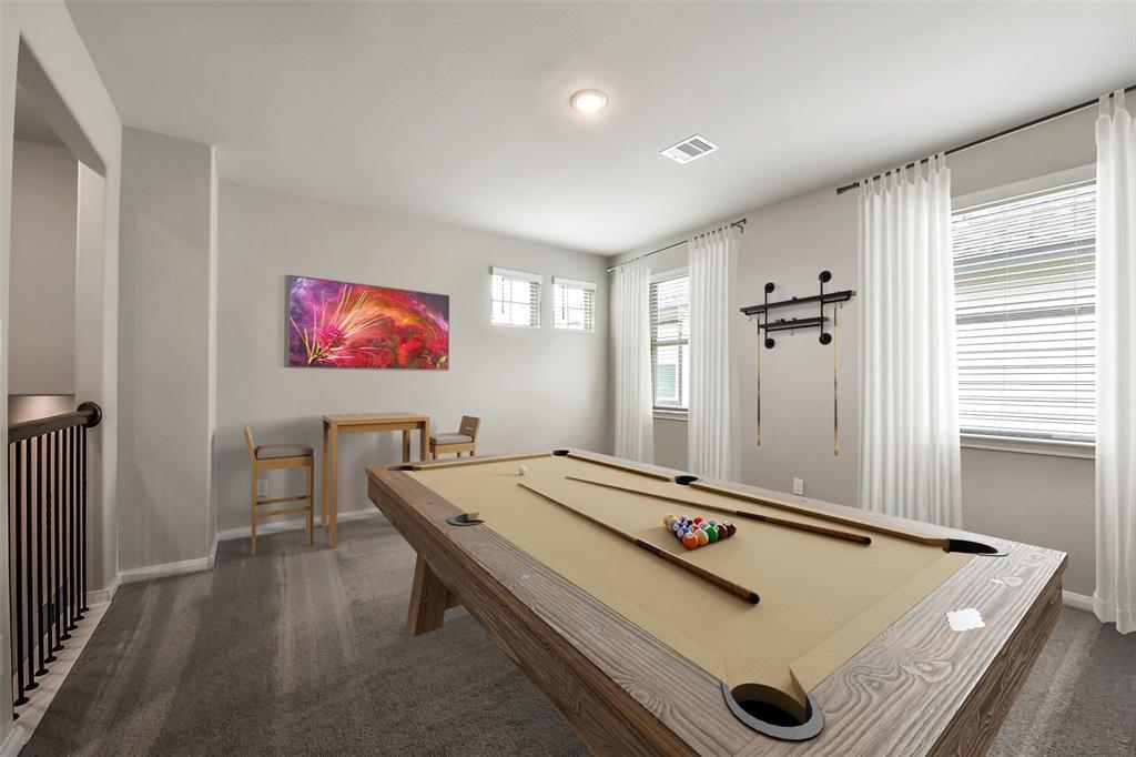 Additional designer touches include wrought iron spindles on the staircase, 2" white designer blinds throughout, and a Wi-Fi-enabled garage door opener. The luxurious primary bath features a spa-inspired walk-in mud set shower with overhead rain fixtures—your personal retreat at home.
